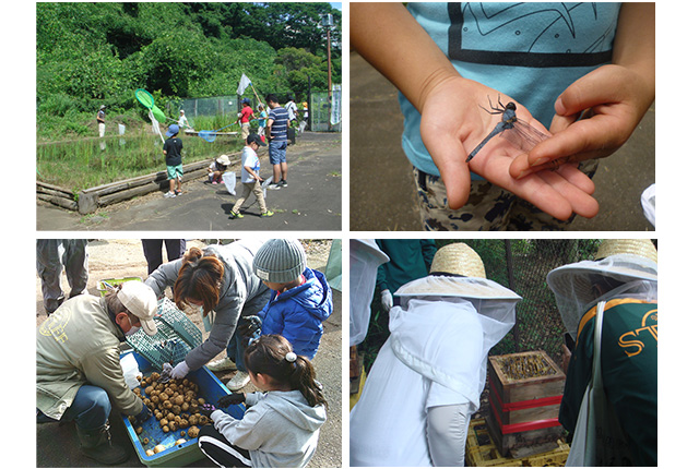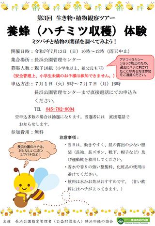 | 公園の「長浜」の名は、柴から富岡に伸びる長い浜があったところから名づけられました。 広大な敷地には、北側には、「多目的運動広場」(サッカー場)のほか、野球場、テニスコート、南側には、野鳥観察園、中央広場には、草地広場や遊具広場があり、憩いの場となっています。 とても自然豊かな長浜公園で“イベント”に参加してみませんか。 ◆第3回 生き物・植物観察ツアー 養蜂(ハチミツ収穫)体験 ミツバチと植物の関係を調べてみよう!