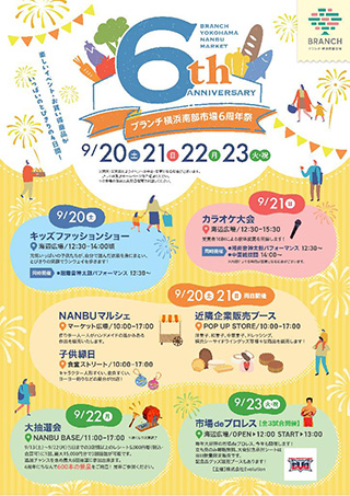 | BRANCH(ブランチ)横浜南部市場は、市場の特性をいかした「食のライブマーケット~地域と人が食でつながる交流拠点~」をコンセプトに2019年9月にオープンしました。 その地域、その季節ならではの食の魅力の発見・体験が出来る食のライブマーケットを目指した商業施設です。施設内には、芝生敷きの海辺広場などの緑豊かな空間や、調理設備を整えた交流スペース(NANBU BASE)もあり、市場の食材を積極的に取り入れたイベントも開催しています。 〈最新イベント情報〉 ◆2025年9月分イベントカレンダー ![]() ※上記をクリックすると、大きな画像(PDFファイル)が開きます(0.5MB) ◆ブランチ横浜南部市場 6周年祭 ブランチ横浜南部市場は2025年9月20日で6周年を迎えます。 楽しいイベント・お買い得商品がいっぱいの4日間です!
