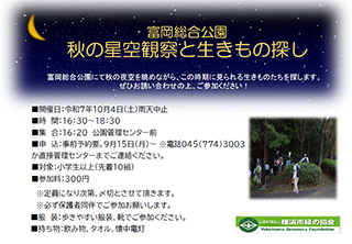 | 古くは海沿いの景勝地であった場所につくられた公園です。 木立の中の散策や野鳥観察を楽しむことができるほか、桜並木、梅林、ボタン園では、四季折々の花を見ることができ、桜の名所にもなっています。 とても自然豊かな富岡総合公園で“イベント”に参加してみませんか。 ◆秋の星空観察と生きもの探し 富岡総合公園にて秋の夜空を眺めながら、この時期に見られる生きものたちを探します。