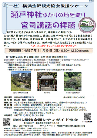 | 海と歴史が交差する金沢八景の地で、源頼朝公の勧請による 古社・瀬戸神社ゆかりの史跡を巡り、最後には瀬戸神社の宮司による貴重な講話を拝聴します。東照宮跡、米倉陣屋跡、金龍禅院など、金沢の歴史を物語る場所を 訪ね、のどかな湾岸の風景とともに、地域の信仰と文化を感じるひとときをお楽しみください。 ~めったにないチャンスを逃さないでください~