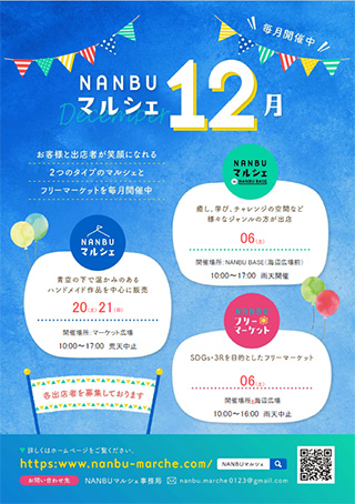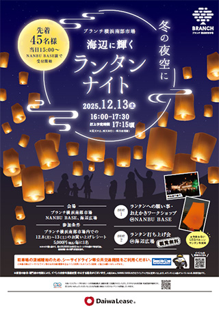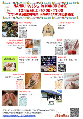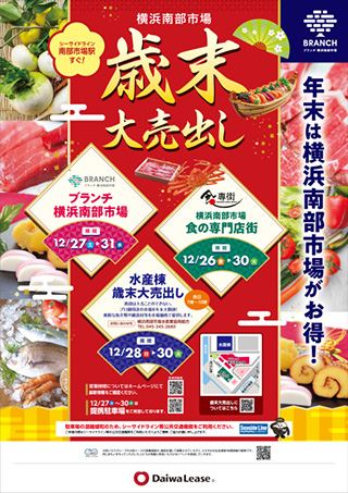 | BRANCH(ブランチ)横浜南部市場は、市場の特性をいかした「食のライブマーケット~地域と人が食でつながる交流拠点~」をコンセプトに2019年9月にオープンしました。 その地域、その季節ならではの食の魅力の発見・体験が出来る食のライブマーケットを目指した商業施設です。施設内には、芝生敷きの海辺広場などの緑豊かな空間や、調理設備を整えた交流スペース(NANBU BASE)もあり、市場の食材を積極的に取り入れたイベントも開催しています。 ◆12月分イベントカレンダー ![]() ※上記をクリックすると、大きな画像(PDFファイル)が開きます(0.6MB) 〈最新イベント情報〉 ◆~横浜南部市場歳末大売出し
