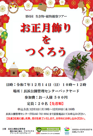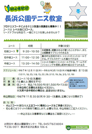 | 公園の「長浜」の名は、柴から富岡に伸びる長い浜があったところから名づけられました。 広大な敷地には、北側には、「多目的運動広場」(サッカー場)のほか、野球場、テニスコート、南側には、野鳥観察園、中央広場には、草地広場や遊具広場があり、憩いの場となっています。 とても自然豊かな長浜公園で“イベント”に参加してみませんか。 ◆長浜公園テニス教室 冬(各コ―ス) プロテニスコーチによりテニス教室を開催します。レベル別に3コ―ス