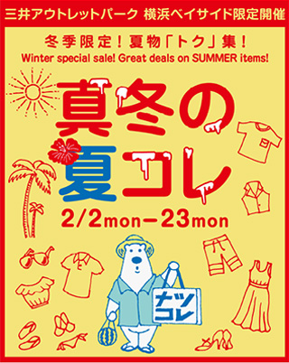 内 容:三井アウトレットパーク 横浜ベイサイド限定!真冬の夏コレ開催♪春夏物が最大70%~80%OFFと、寒い冬にこそ夏のアイテムをおトクにお買物できるチャンスです!