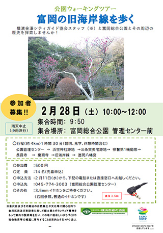| 古くは海沿いの景勝地であった場所につくられた公園です。 木立の中の散策や野鳥観察を楽しむことができるほか、桜並木、梅林、ボタン園では、四季折々の花を見ることができ、桜の名所にもなっています。 とても自然豊かな富岡総合公園で“イベント”に参加してみませんか。 ◆公園ウォーキングツアー 富岡の旧海岸線を歩く 横濱金澤シティガイド協会スタッフと富岡総合公園とその周辺の歴史探索しませんか!