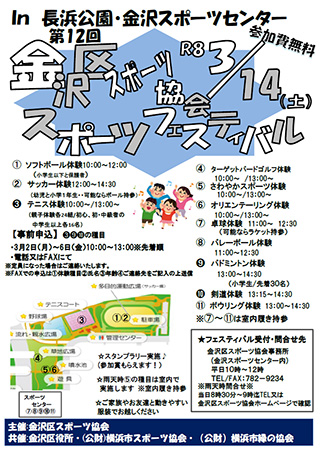 毎年、区民の皆さんに気軽にスポーツと触れていただく機会として「金沢区スポ―ツ協会スポーツフェスティバル」を開催しています。各種スポーツのほか、スタンプラリーも実施します。どなたでも楽しめる内容をご用意していますので、日頃の運動不足の解消、新しいスポーツ体験に、ご参加お待ちしています。