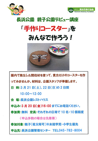 | 公園の「長浜」の名は、柴から富岡に伸びる長い浜があったところから名づけられました。 広大な敷地には、北側には、「多目的運動広場」(サッカー場)のほか、野球場、テニスコート、南側には、野鳥観察園、中央広場には、草地広場や遊具広場があり、憩いの場となっています。 とても自然豊かな長浜公園で“イベント”に参加してみませんか。 ◆親子公園デビュー講座「手作りコースター」をみんなで作ろう! 園内で発生した間伐材を使って、貴方だけのコースターを作ってみませんか。