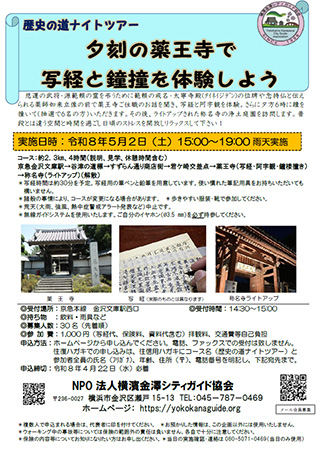 悲運の武将・源範頼の霊を弔うために範頼の戒名・太寧寺殿(タイヘジデン)の位牌や念持仏と伝えられる薬師如来立像の前で薬王寺ご住職のお話を聞き、写経と阿字観を体験。さらに夕方6時に鐘を撞いて(抽選で6名の方)いただきます。その後、ライトアップされた称名寺の浄土庭園を訪問します。普段とは違う空間と時間を過ごし日頃のストレスを開放しリラックスして下さい!